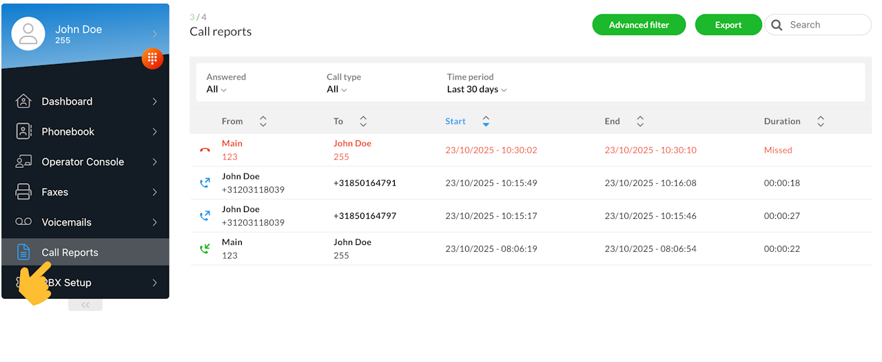 Filter results by date range, call type, or answered status using the Advanced filter option