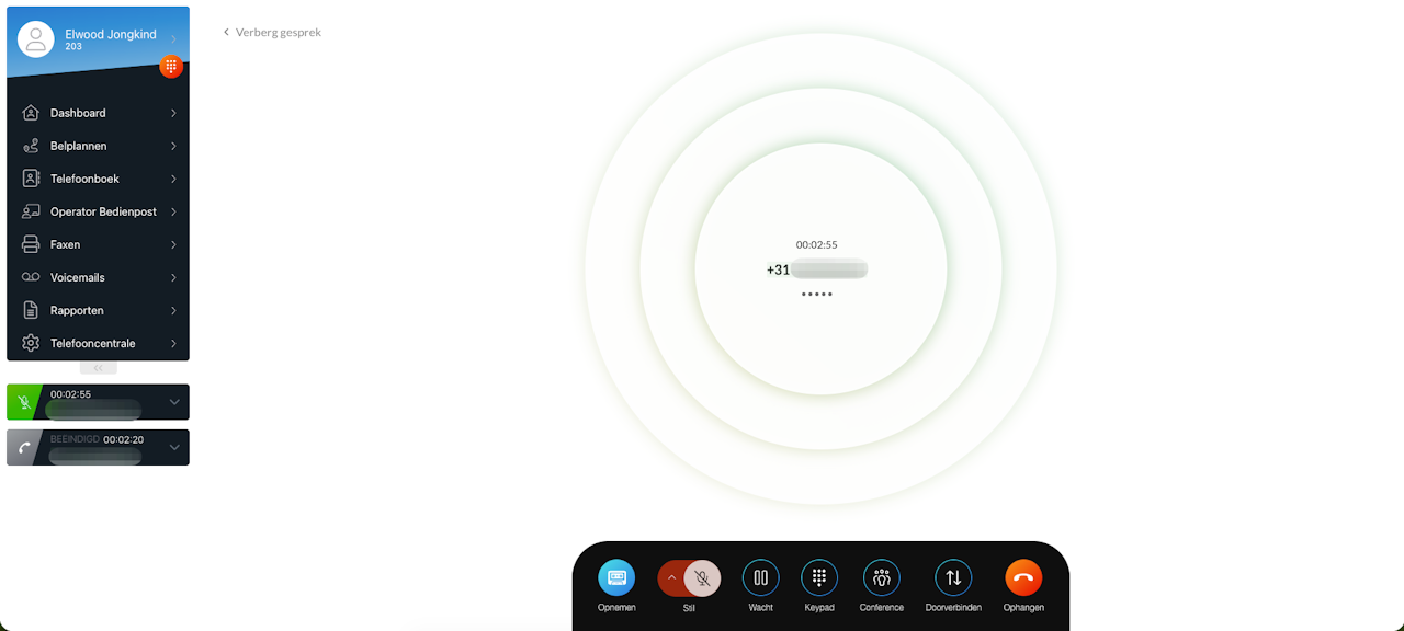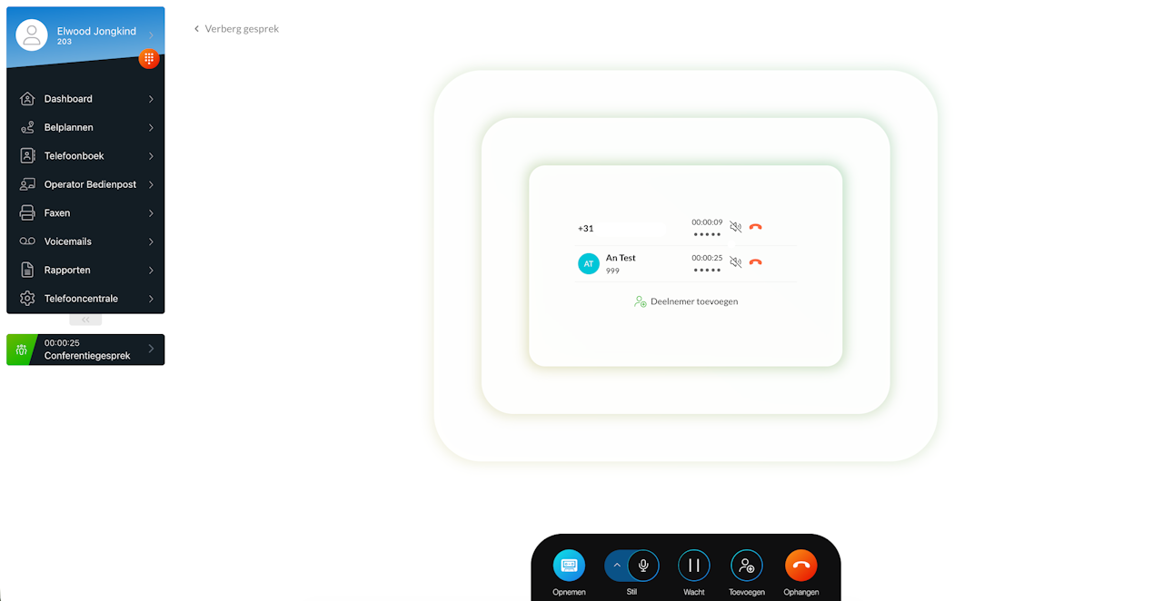 In het gespreksscherm zie je nu alle deelnemers overzichtelijk weergegeven, elk met hun eigen gespreksduur.