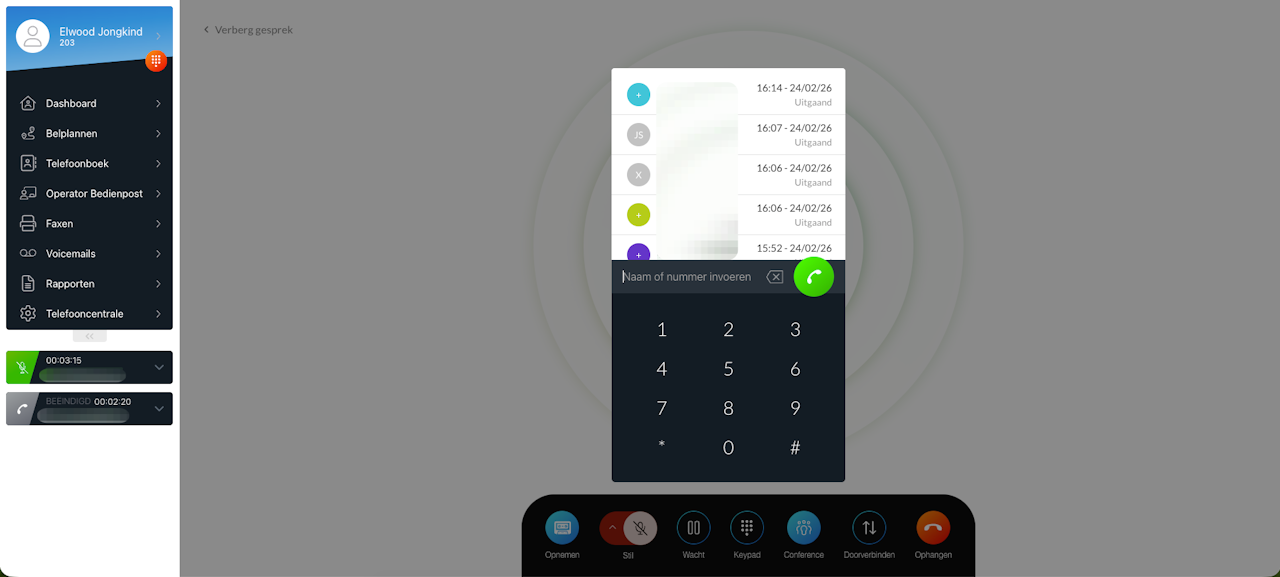 ๐ก De actiebalk bevat de knoppen: Opnemen, Stil, Wacht, Keypad, Conference, Doorverbinden en Ophangen.